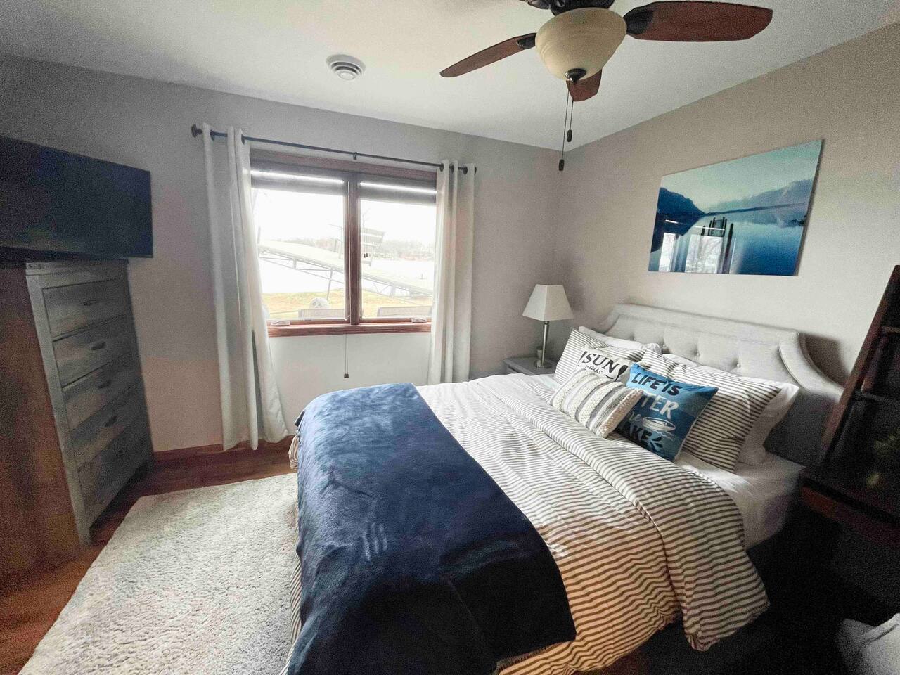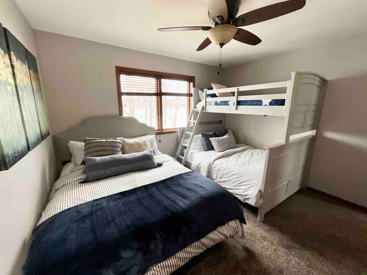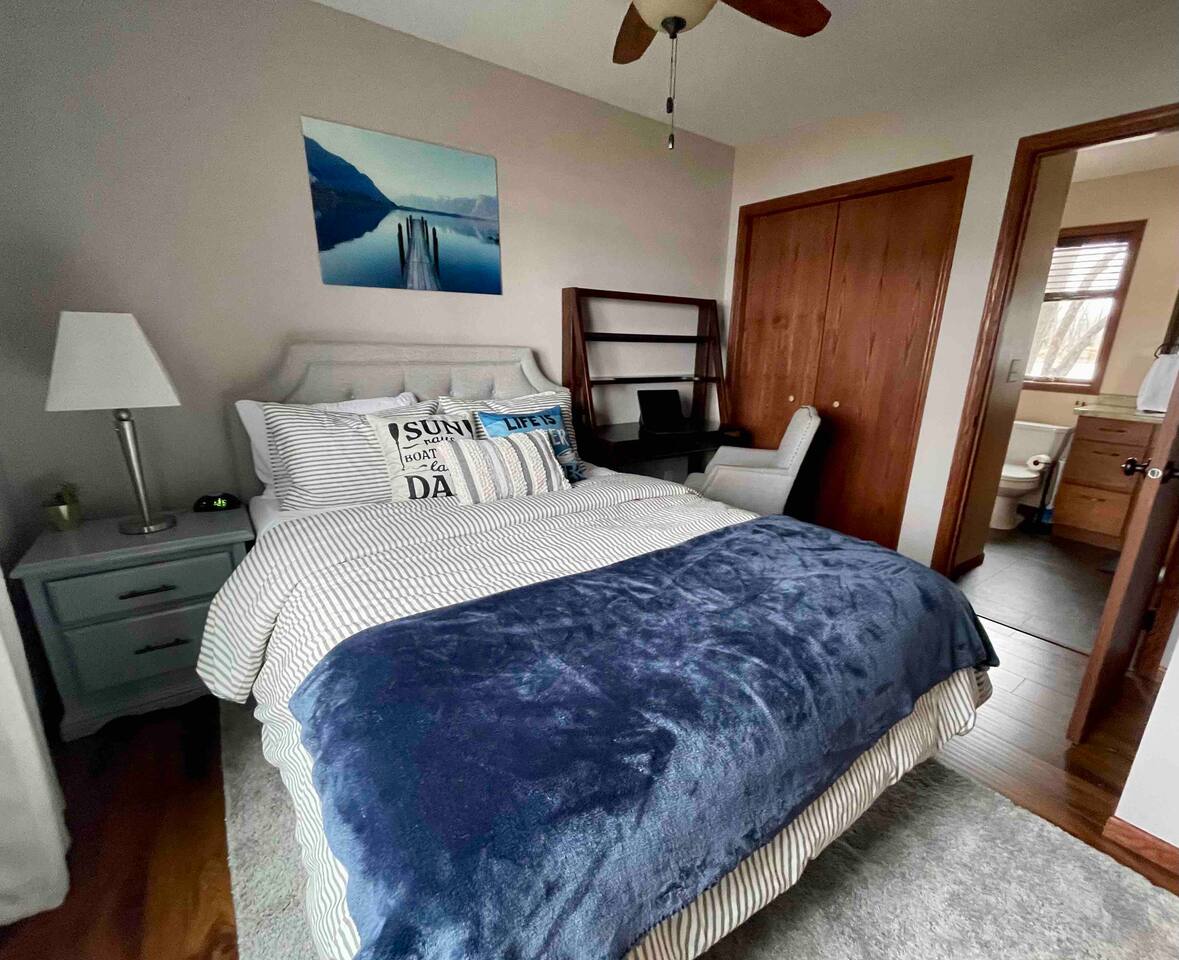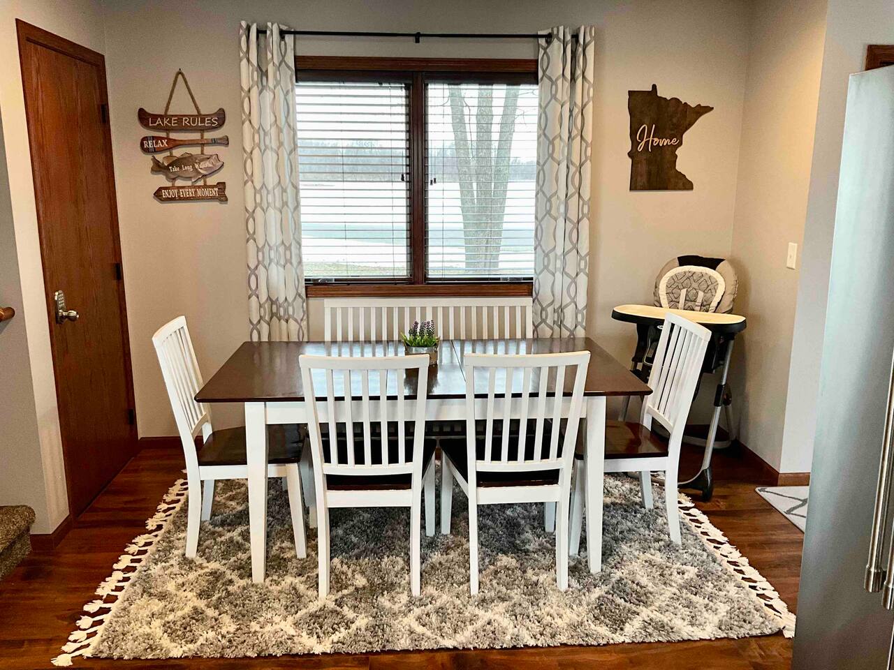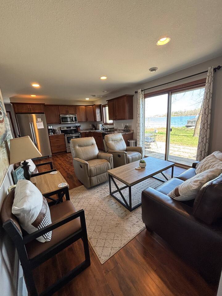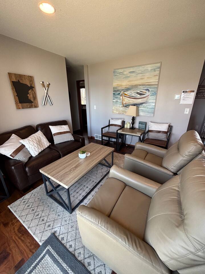 Step inside to a spacious entryway with a bench and closet to store coats and belongings. The open-concept dining area seats six with a high chair, perfect for family meals. The fully stocked, modern kitchen makes cooking a joy, featuring a state-of-the-art Waterdrop filtration system for the purest drinking water. Start your mornings with coffee using the provided beans, creamer, and sugar. The living area offers comfortable seating, beautiful lake views, and a smart TV with Netflix, Hulu, and Disney+ for relaxing evenings. The main floor bedroom has a queen bed, large dresser, smart TV, and a dedicated workspace with a desk and lake views. A main floor bathroom, accessible from both the bedroom and living space, includes shampoo, conditioner, and body wash dispensers for your convenience. Upstairs, enjoy a game of wall-mounted Connect 4 or relax in the second living space featuring an electric fireplace, TV with Firestick, Xbox Series X, Nintendo Wii, and a DVD player. Upstairs sleeping options include two bedrooms each with a queen bed and a full-over-twin bunk bed. Connected to one of the bedrooms (with no separate hallway access) is a bonus American-themed room with two twin beds—perfect for children, teens, or young adults. A selection of toys, games, and books is provided for kids. Outside, dine on the patio with two tables (seating for six and three) and a propane grill. Unwind around the fire pit with four Adirondack chairs or relax on the beach swing or loungers. Beach toys and an umbrella are provided. The shed includes 4 paddle boards, 2 kayaks, a lily pad, and a splash pad for kids, along with a variety of lawn games. The dock offers seating for fishing, sunbathing, or simply taking in the beauty of Minnesota lakes country.