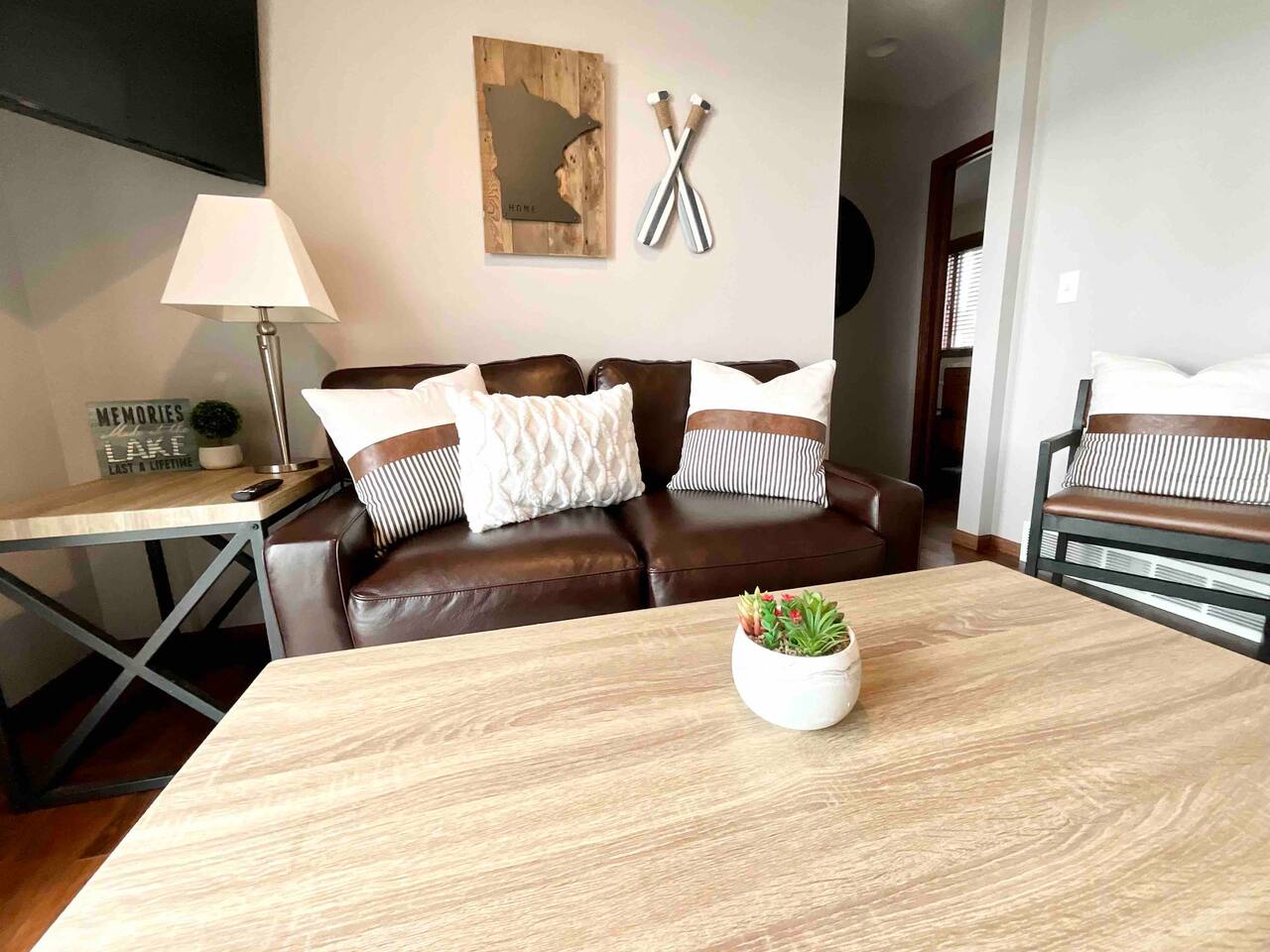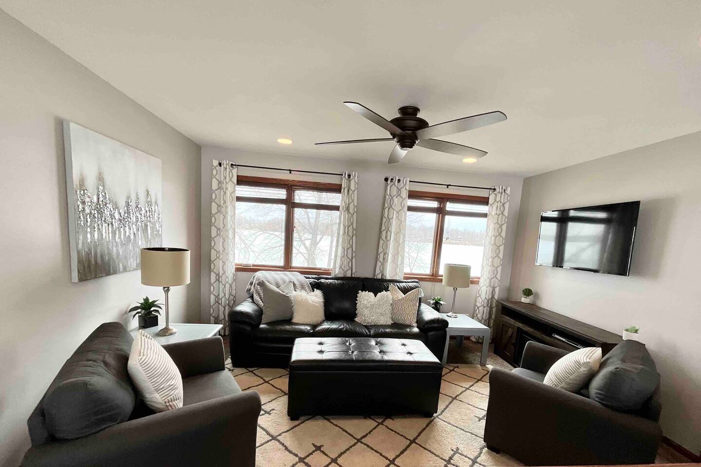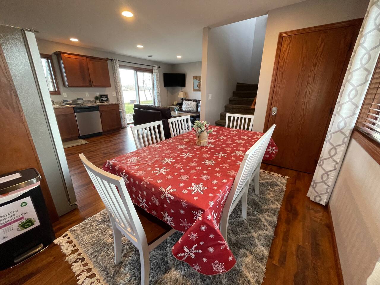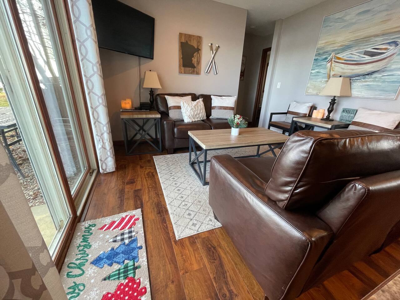 Step inside to a spacious entryway with a bench and closet to store coats and belongings. The open-concept dining area seats six with a high chair, perfect for family meals. The fully stocked, modern kitchen makes cooking a joy, featuring a state-of-the-art Waterdrop filtration system for the purest drinking water. Start your mornings with coffee using the provided beans, creamer, and sugar. The living area offers comfortable seating, beautiful lake views, and a smart TV with Netflix, Hulu, and Disney+ for relaxing evenings. The main floor bedroom has a queen bed, large dresser, smart TV, and a dedicated workspace with a desk and lake views. A main floor bathroom, accessible from both the bedroom and living space, includes shampoo, conditioner, and body wash dispensers for your convenience. Upstairs, enjoy a game of wall-mounted Connect 4 or relax in the second living space featuring an electric fireplace, TV with Firestick, Xbox Series X, Nintendo Wii, and a DVD player. Upstairs sleeping options include two bedrooms each with a queen bed and a full-over-twin bunk bed. Connected to one of the bedrooms (with no separate hallway access) is a bonus American-themed room with two twin beds—perfect for children, teens, or young adults. A selection of toys, games, and books is provided for kids. Outside, dine on the patio with two tables (seating for six and three) and a propane grill. Unwind around the fire pit with four Adirondack chairs or relax on the beach swing or loungers. Beach toys and an umbrella are provided. The shed includes 4 paddle boards, 2 kayaks, a lily pad, and a splash pad for kids, along with a variety of lawn games. The dock offers seating for fishing, sunbathing, or simply taking in the beauty of Minnesota lakes country.