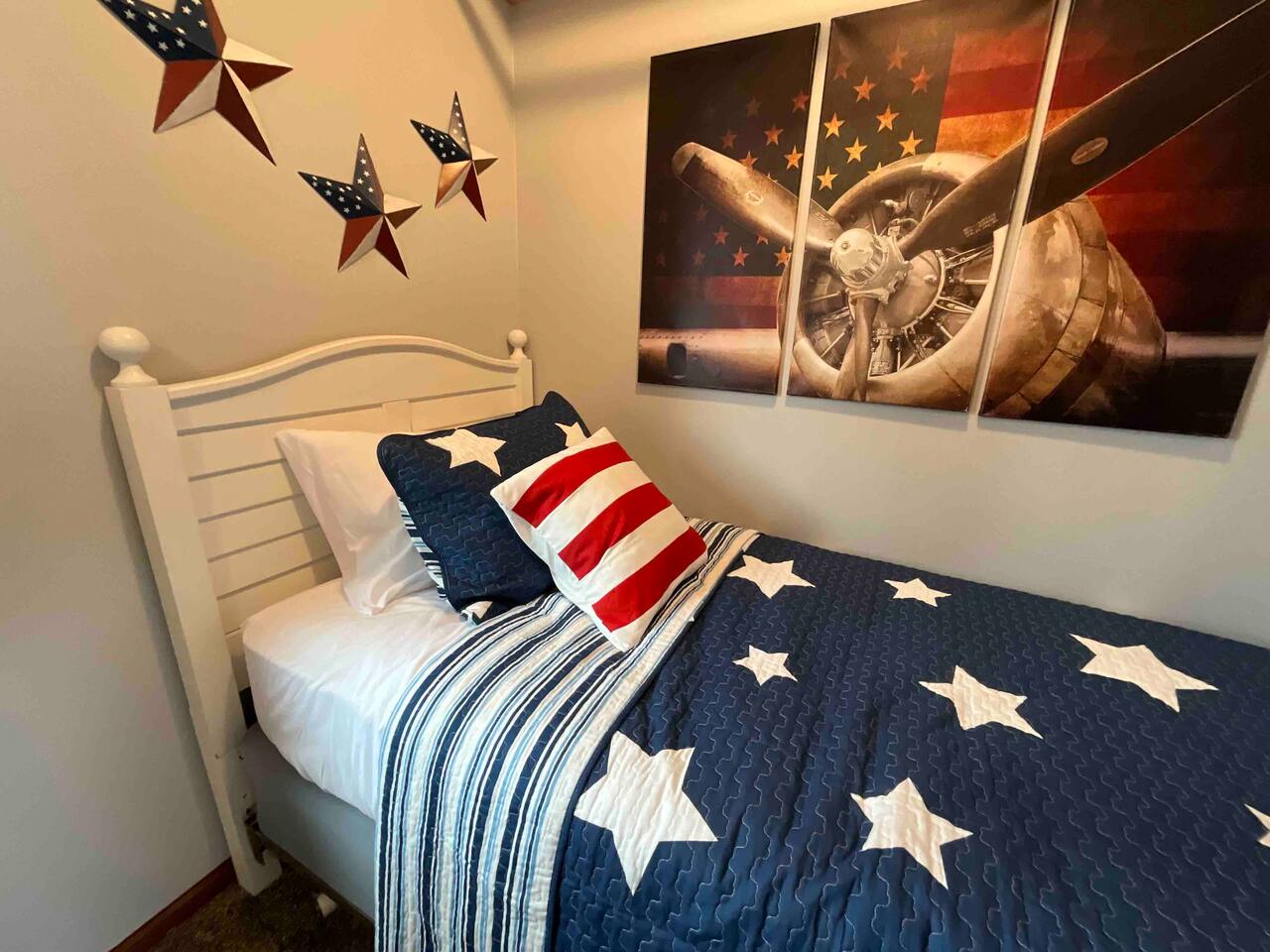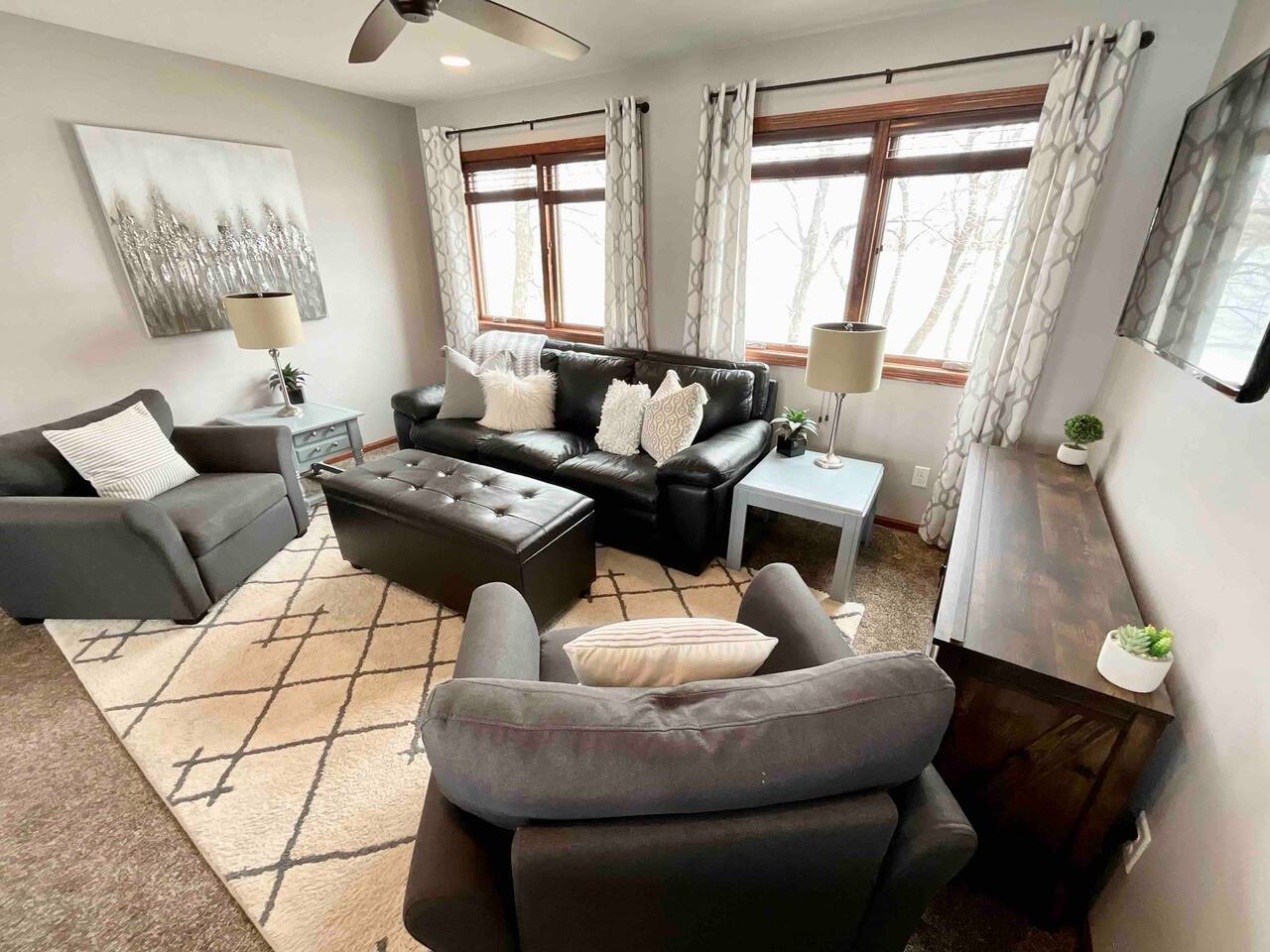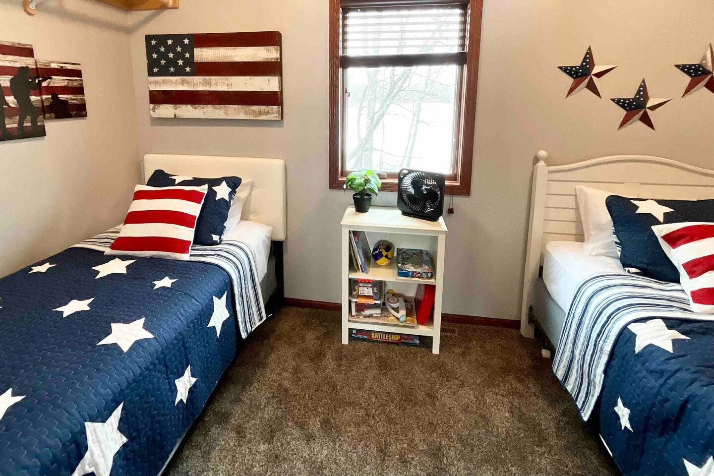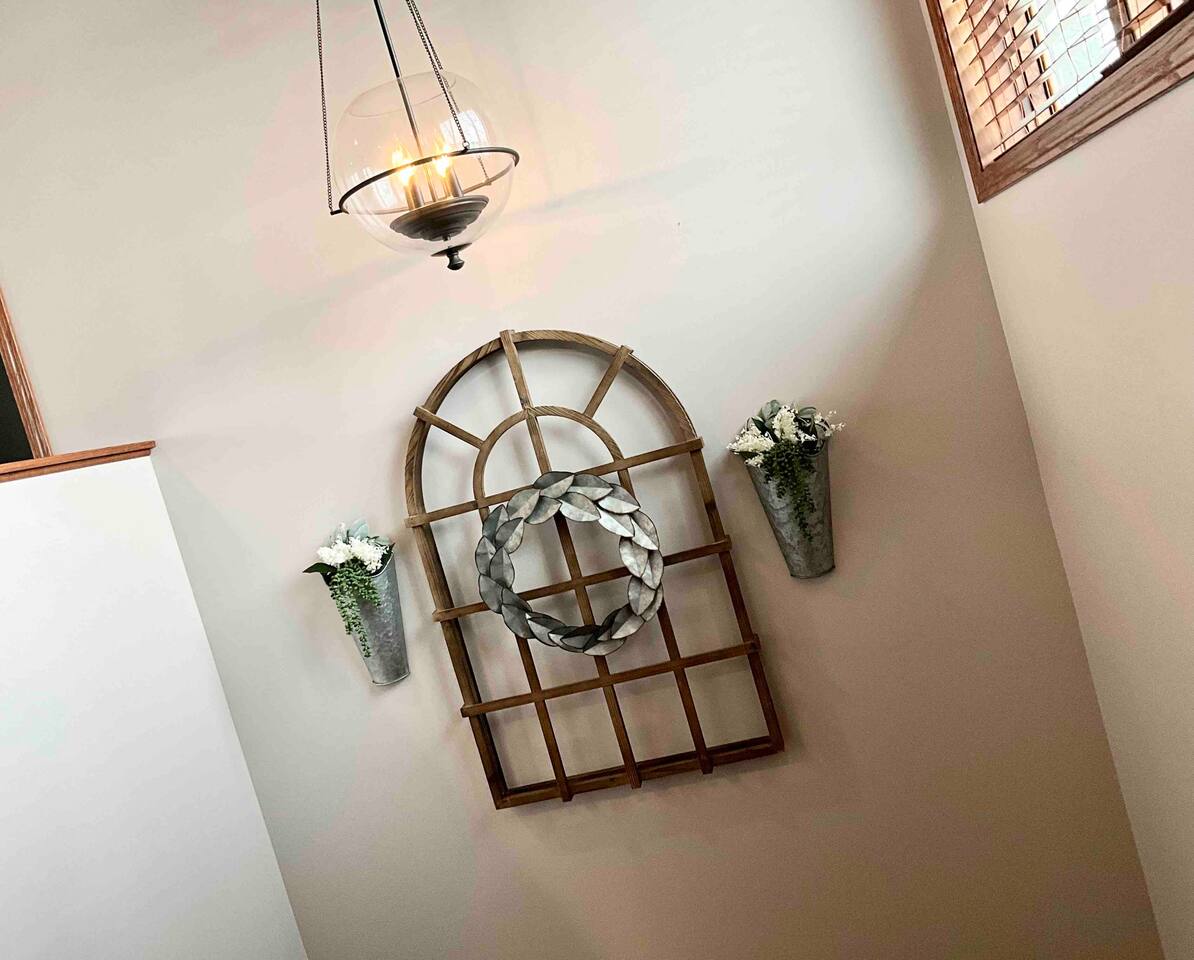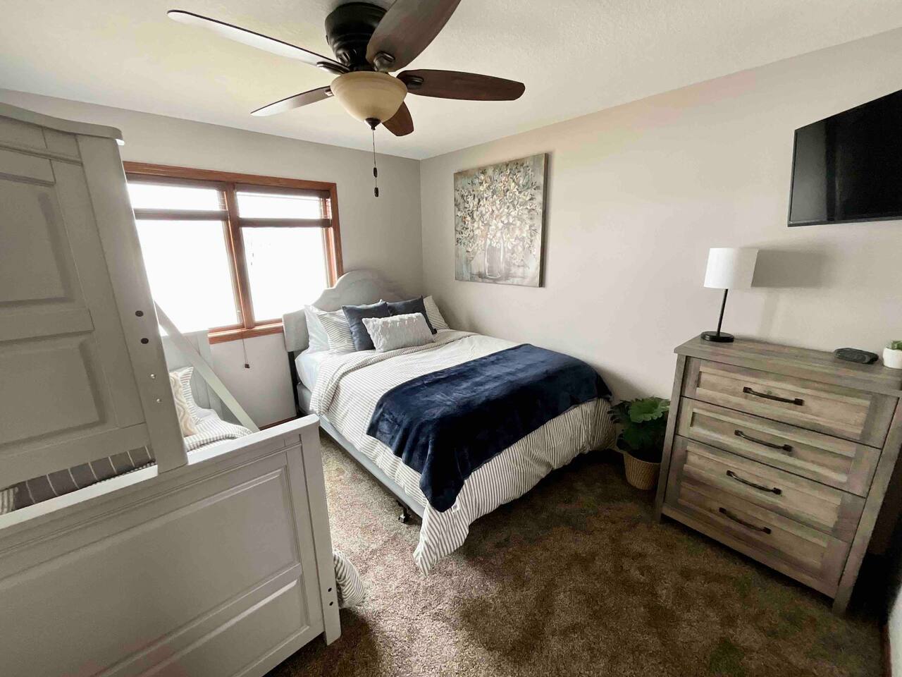 Step inside to a spacious entryway with a bench and closet to store coats and belongings. The open-concept dining area seats six with a high chair, perfect for family meals. The fully stocked, modern kitchen makes cooking a joy, featuring a state-of-the-art Waterdrop filtration system for the purest drinking water. Start your mornings with coffee using the provided beans, creamer, and sugar. The living area offers comfortable seating, beautiful lake views, and a smart TV with Netflix, Hulu, and Disney+ for relaxing evenings. The main floor bedroom has a queen bed, large dresser, smart TV, and a dedicated workspace with a desk and lake views. A main floor bathroom, accessible from both the bedroom and living space, includes shampoo, conditioner, and body wash dispensers for your convenience. Upstairs, enjoy a game of wall-mounted Connect 4 or relax in the second living space featuring an electric fireplace, TV with Firestick, Xbox Series X, Nintendo Wii, and a DVD player. Upstairs sleeping options include two bedrooms each with a queen bed and a full-over-twin bunk bed. Connected to one of the bedrooms (with no separate hallway access) is a bonus American-themed room with two twin beds—perfect for children, teens, or young adults. A selection of toys, games, and books is provided for kids. Outside, dine on the patio with two tables (seating for six and three) and a propane grill. Unwind around the fire pit with four Adirondack chairs or relax on the beach swing or loungers. Beach toys and an umbrella are provided. The shed includes 4 paddle boards, 2 kayaks, a lily pad, and a splash pad for kids, along with a variety of lawn games. The dock offers seating for fishing, sunbathing, or simply taking in the beauty of Minnesota lakes country.