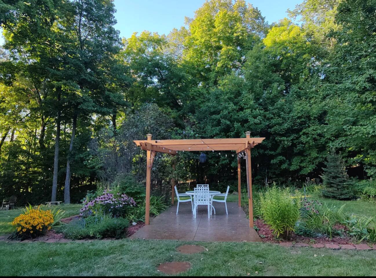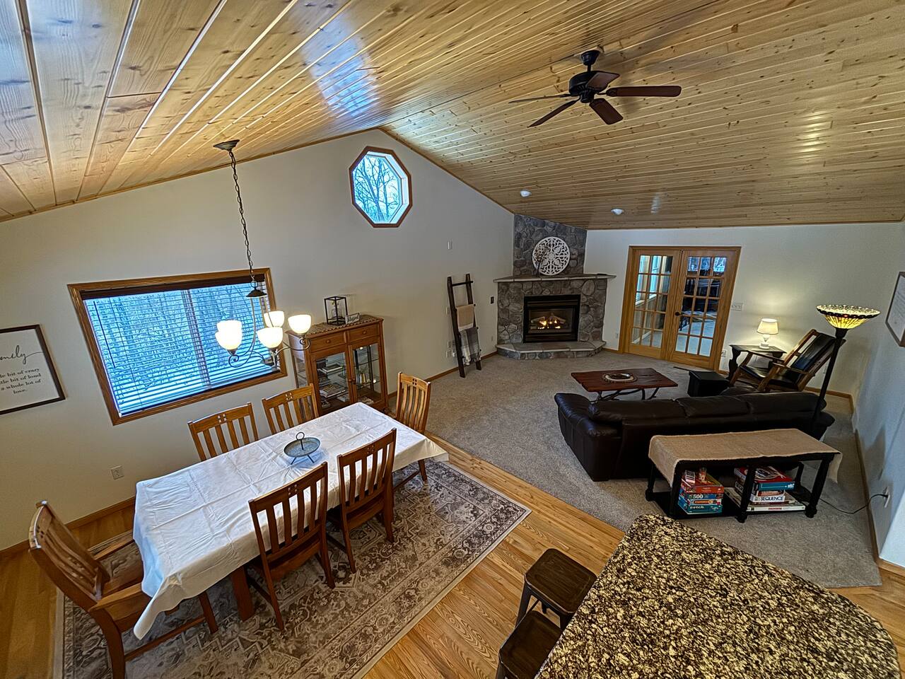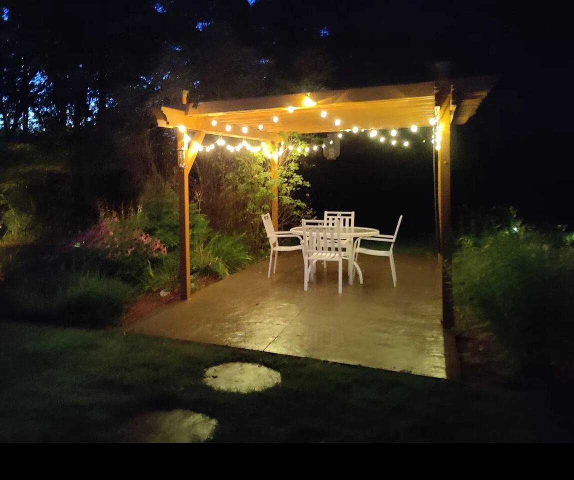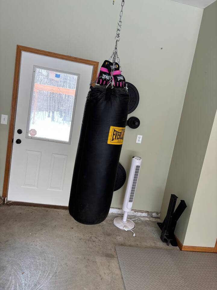 Unique Opportunity! The owner’s of this beautiful home are currently away on a mission trip to Guatemala specifically helping widows and children. Your reservation helps to make this amazing mission possible - thank you ❤️! Upon entering Whispering Woods, you’ll be greeted by a half bathroom along with plenty of hooks to hang your coat and belongings. Continue into the large, open concept kitchen which is fully stocked and ready for cooking meals together with your family or friends. Pull up a seat at one of 3 counter stools or sit around a large table with seating for 6 in the dining area. Right off the kitchen space is the first bedroom complete with a comfortable full sized bed along with a nice work space and a bathroom. The spacious bathroom offers a large vanity and a stand up shower. Also on the main floor is a cozy living room with plenty of seating, lots of board games to enjoy and a beautiful stone gas fireplace (non-functional in 2026 going forward). French doors lead into a large sunroom with gorgeous views of the surrounding trees and landscape. The sunroom contains additional comfortable seating for that delicious morning coffee, a gas fireplace as well as a smart TV with a DVD/VHS player (DVD’s provided). A door leads out into the back yard space where there is a beautiful pergola with an outdoor table and chairs to enjoy meals with family and friends. Heading downstairs, there is a large bedroom with a king sized bed, access to outdoor spaces, and plenty of closet and dresser space. This room would be perfect for a family with a pack and play or cots for children. The bedroom is connected to a large bathroom with a full sized bathtub/shower combination. It also contains the washer and dryer along with an ironing board and iron. A second bedroom in the lower level offers two beds - a queen bed and a full sized bed. Two air mattresses are also provided for additional sleeping arrangements. Connected to the house is an insulated and heated two stall garage. The garage contains a dedicated gym/workout space with a bench, weights, a fan and a punching bag. There is also a lawn Jenga game and a desk and chair. There is space in the garage to park one vehicle during your stay along with space for up to 5 vehicles in the driveway.