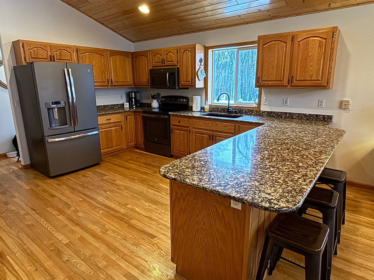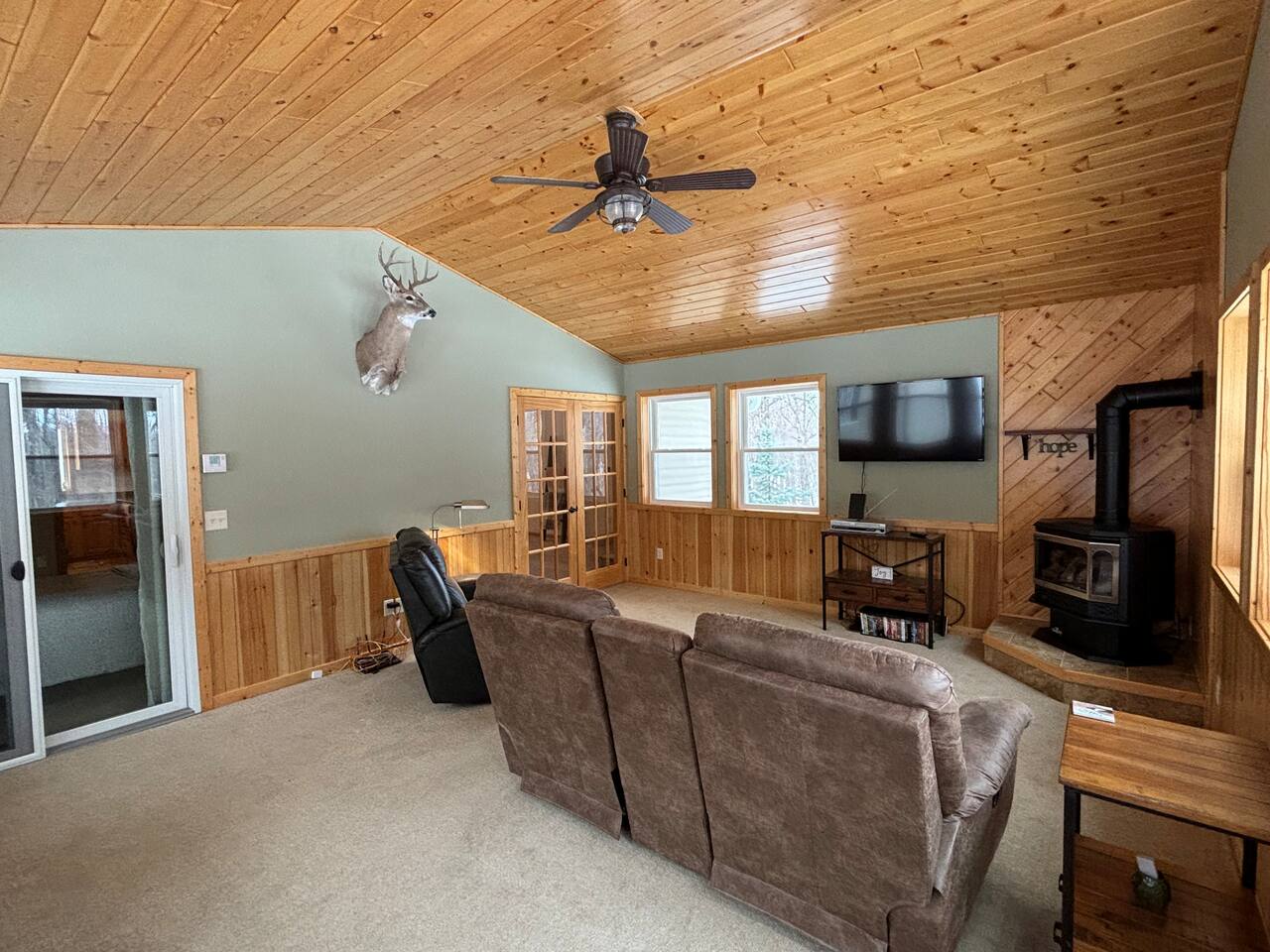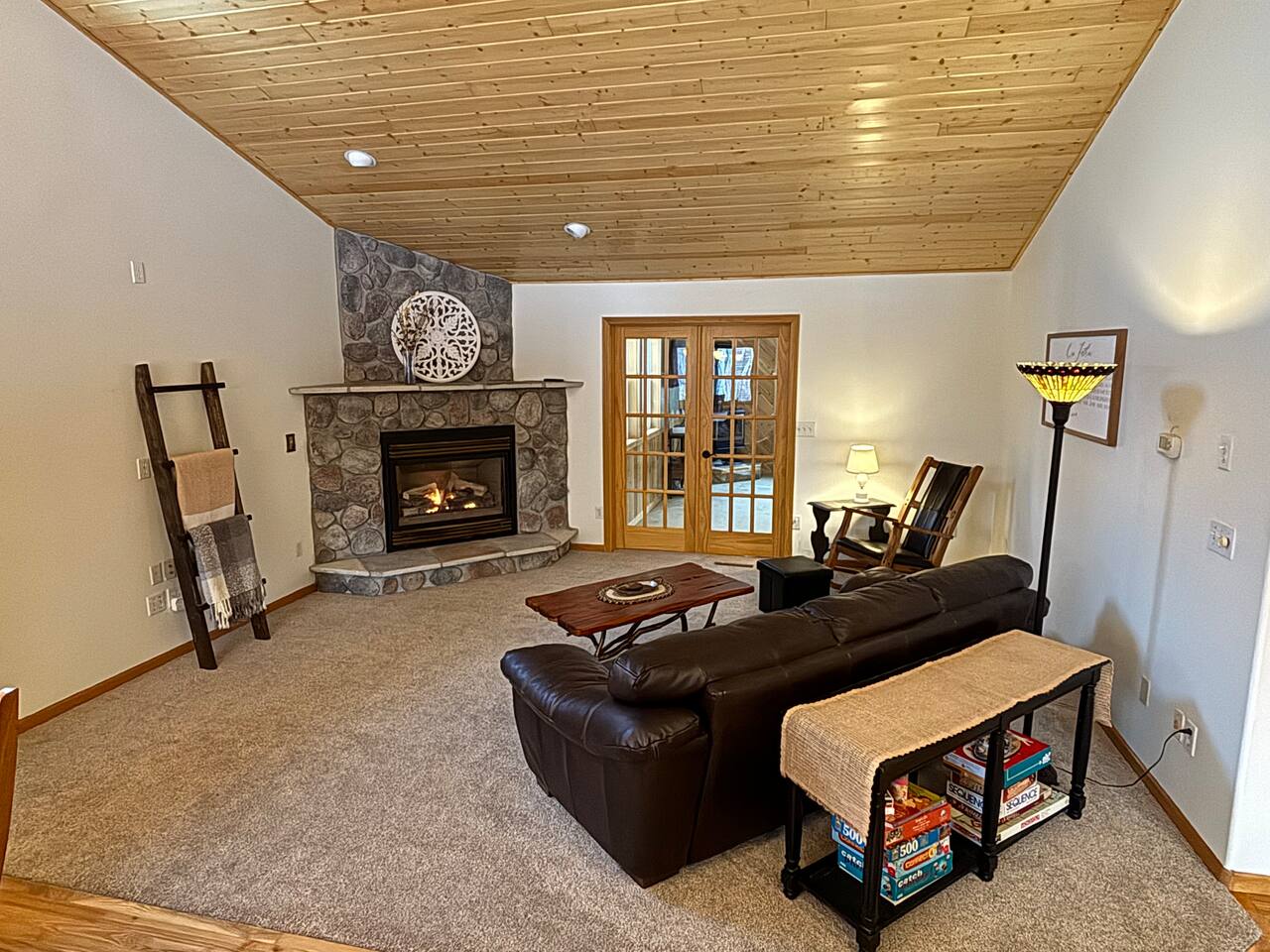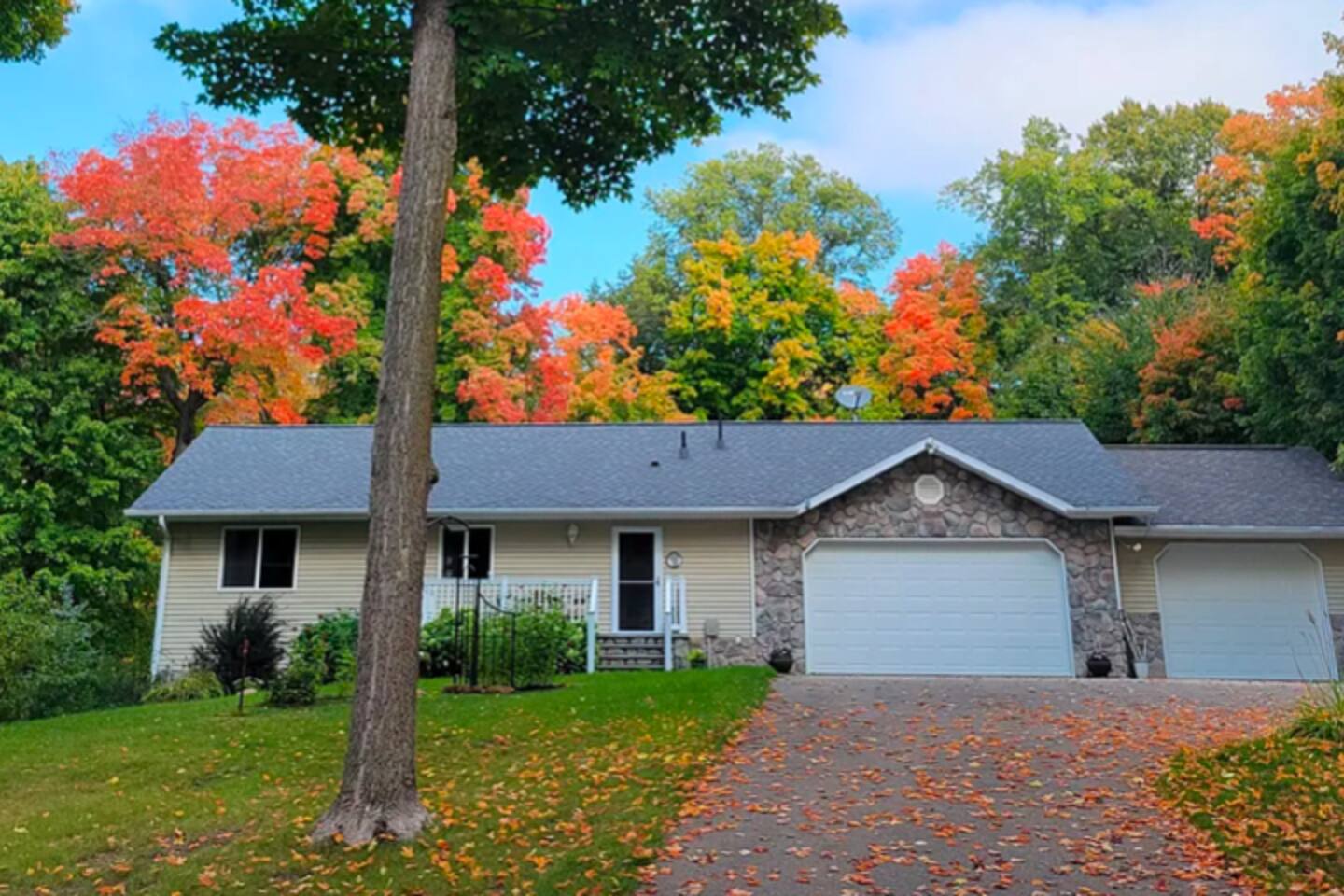Unique Opportunity! The owner’s of this beautiful home are currently away on a mission trip to Guatemala specifically helping widows and children. Your reservation helps to make this amazing mission possible - thank you ❤️! Upon entering Whispering Woods, you’ll be greeted by a half bathroom along with plenty of hooks to hang your coat and belongings. Continue into the large, open concept kitchen which is fully stocked and ready for cooking meals together with your family or friends. Pull up a seat at one of 3 counter stools or sit around a large table with seating for 6 in the dining area. Right off the kitchen space is the first bedroom complete with a comfortable full sized bed along with a nice work space and a bathroom. The spacious bathroom offers a large vanity and a stand up shower. Also on the main floor is a cozy living room with plenty of seating, lots of board games to enjoy and a beautiful stone gas fireplace (non-functional in 2026 going forward). French doors lead into a large sunroom with gorgeous views of the surrounding trees and landscape. The sunroom contains additional comfortable seating for that delicious morning coffee, a gas fireplace as well as a smart TV with a DVD/VHS player (DVD’s provided). A door leads out into the back yard space where there is a beautiful pergola with an outdoor table and chairs to enjoy meals with family and friends. Heading downstairs, there is a large bedroom with a king sized bed, access to outdoor spaces, and plenty of closet and dresser space. This room would be perfect for a family with a pack and play or cots for children. The bedroom is connected to a large bathroom with a full sized bathtub/shower combination. It also contains the washer and dryer along with an ironing board and iron. A second bedroom in the lower level offers two beds - a queen bed and a full sized bed. Two air mattresses are also provided for additional sleeping arrangements. Connected to the house is an insulated and heated two stall garage. The garage contains a dedicated gym/workout space with a bench, weights, a fan and a punching bag. There is also a lawn Jenga game and a desk and chair. There is space in the garage to park one vehicle during your stay along with space for up to 5 vehicles in the driveway.