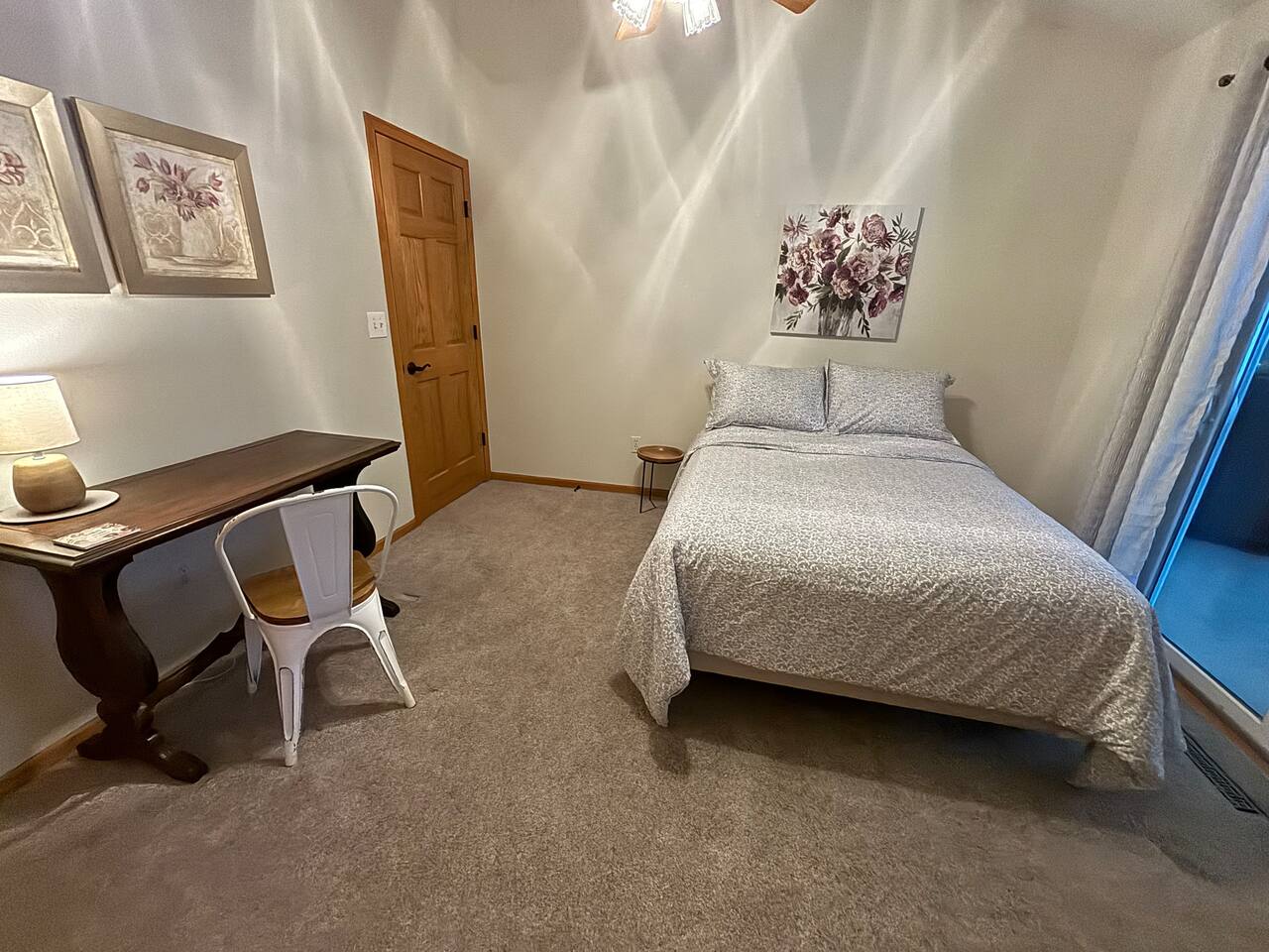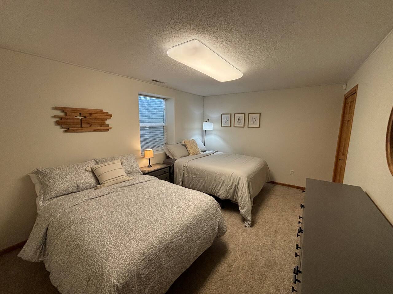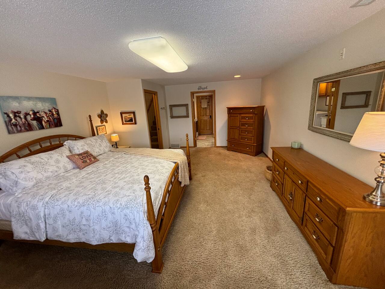 Unique Opportunity! The owner’s of this beautiful home are currently away on a mission trip to Guatemala specifically helping widows and children. Your reservation helps to make this amazing mission possible - thank you ❤️! Upon entering Whispering Woods, you’ll be greeted by a half bathroom along with plenty of hooks to hang your coat and belongings. Continue into the large, open concept kitchen which is fully stocked and ready for cooking meals together with your family or friends. Pull up a seat at one of 3 counter stools or sit around a large table with seating for 6 in the dining area. Right off the kitchen space is the first bedroom complete with a comfortable full sized bed along with a nice work space and a bathroom. The spacious bathroom offers a large vanity and a stand up shower. Also on the main floor is a cozy living room with plenty of seating, lots of board games to enjoy and a beautiful stone gas fireplace (non-functional in 2026 going forward). French doors lead into a large sunroom with gorgeous views of the surrounding trees and landscape. The sunroom contains additional comfortable seating for that delicious morning coffee, a gas fireplace as well as a smart TV with a DVD/VHS player (DVD’s provided). A door leads out into the back yard space where there is a beautiful pergola with an outdoor table and chairs to enjoy meals with family and friends. Heading downstairs, there is a large bedroom with a king sized bed, access to outdoor spaces, and plenty of closet and dresser space. This room would be perfect for a family with a pack and play or cots for children. The bedroom is connected to a large bathroom with a full sized bathtub/shower combination. It also contains the washer and dryer along with an ironing board and iron. A second bedroom in the lower level offers two beds - a queen bed and a full sized bed. Two air mattresses are also provided for additional sleeping arrangements. Connected to the house is an insulated and heated two stall garage. The garage contains a dedicated gym/workout space with a bench, weights, a fan and a punching bag. There is also a lawn Jenga game and a desk and chair. There is space in the garage to park one vehicle during your stay along with space for up to 5 vehicles in the driveway.