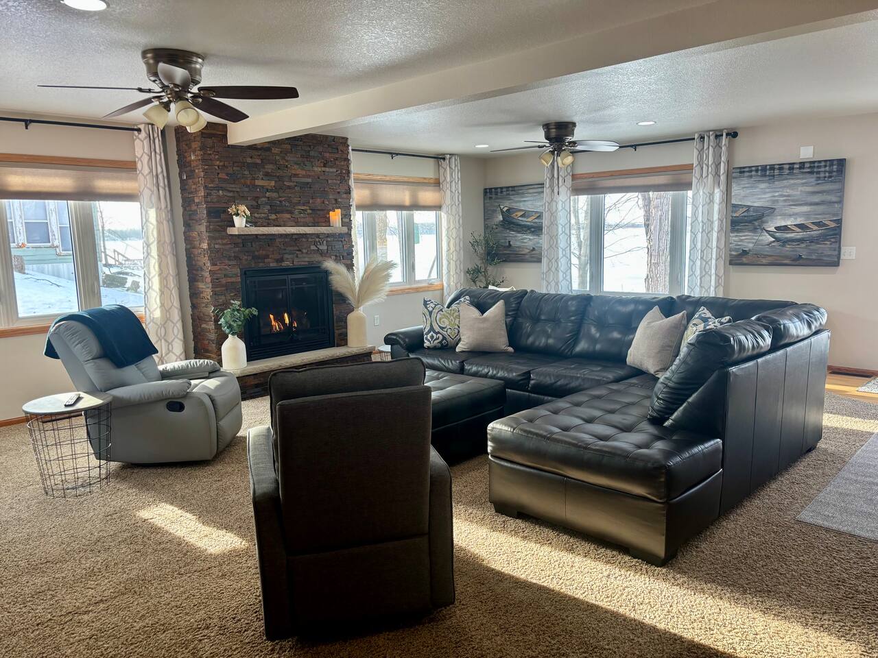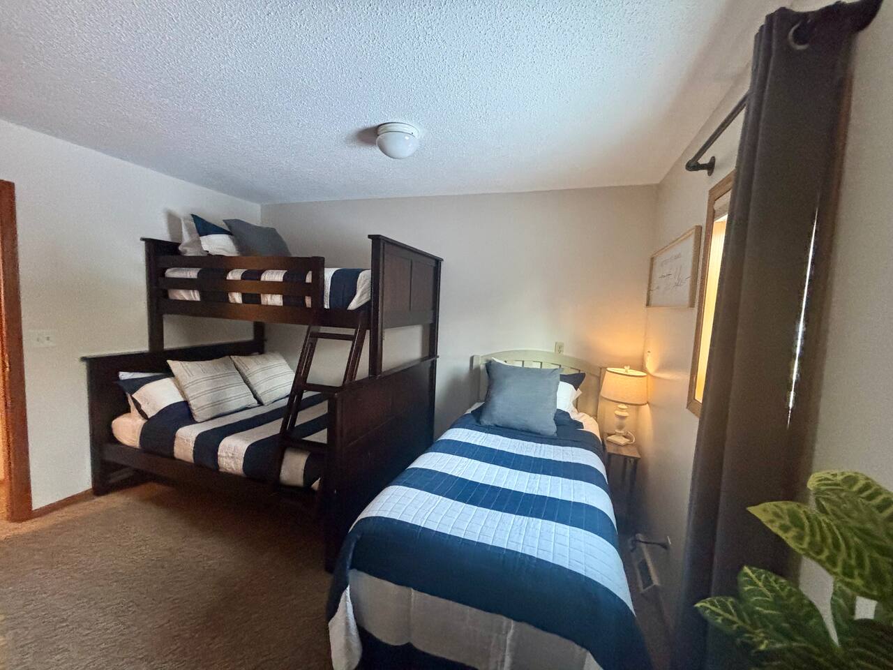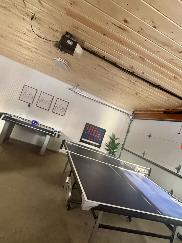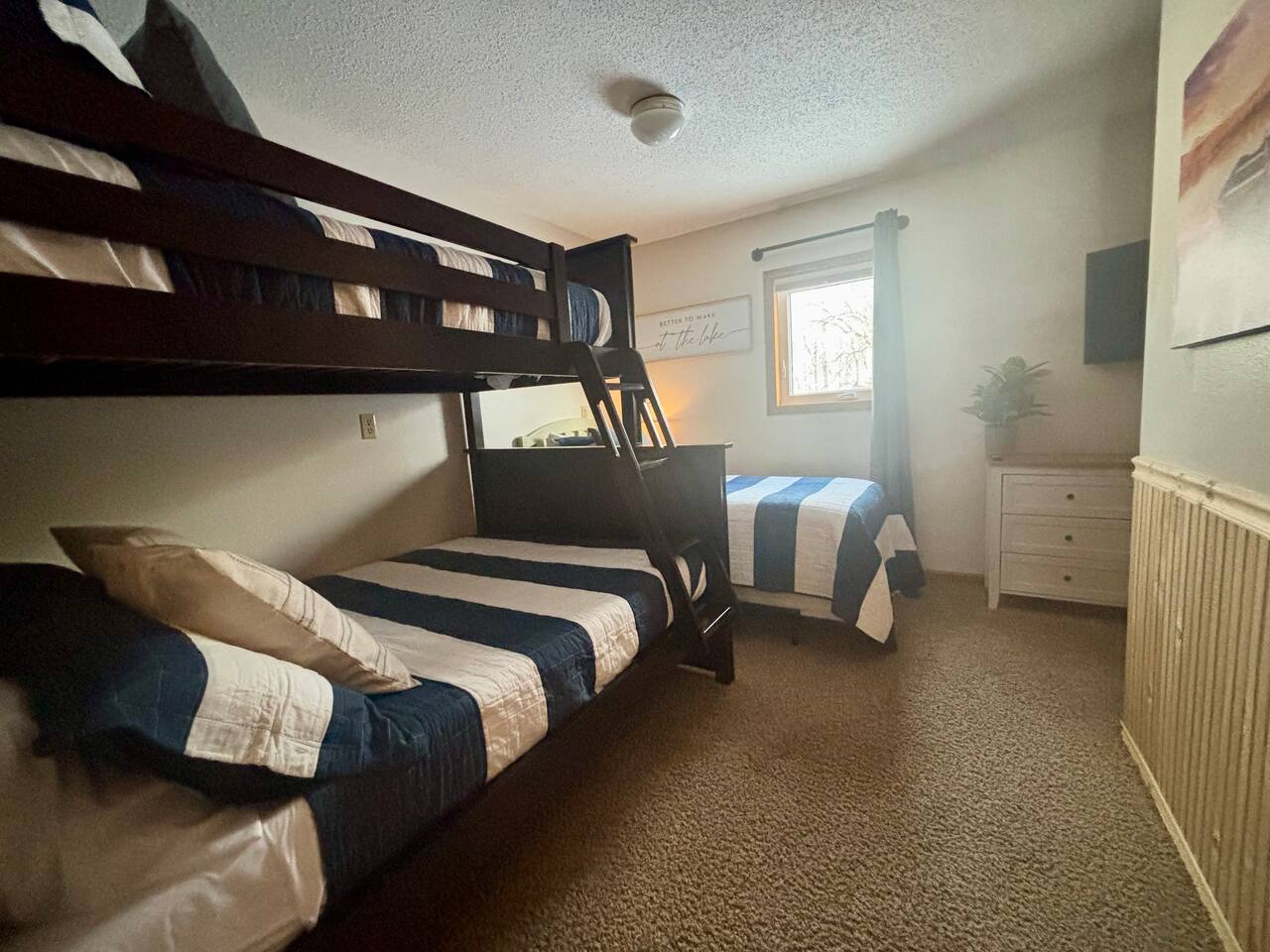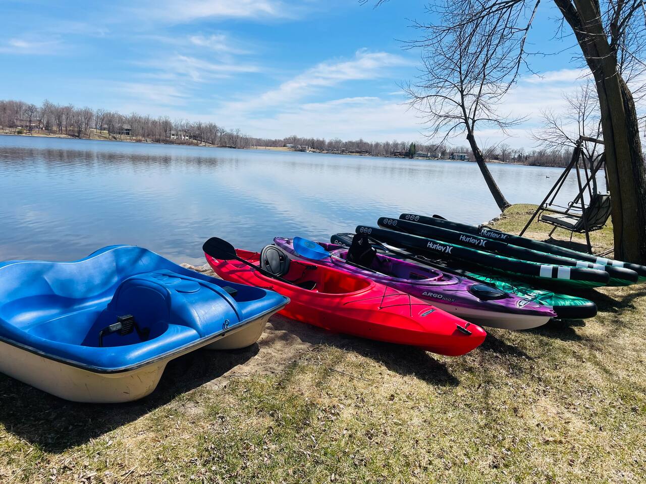 Sunset Beach Getaway is the kind of place where families slow down, spread out, and truly reconnect. From the moment you step inside, the open-concept main floor welcomes you with space to gather, laugh, and linger. Sunlight pours through large windows into the living room, where a cozy natural gas fireplace sets the tone for relaxed mornings, board-game afternoons, and quiet evenings after a day on the lake. The heart of the home is the fully stocked kitchen—designed for real cooking and shared meals. With every appliance and amenity you need, it’s easy to prepare everything from pancake breakfasts to holiday-style dinners. The dining area comfortably seats 13, with a high chair ready for the youngest guest, making this home ideal for multi-generational stays. Just off the main living space, the spacious primary bedroom offers a peaceful retreat with a queen bed, while the large main-floor bathroom feels spa-like with double sinks, heated floors, and a jet tub/shower combo. A washer and dryer on the main level make longer stays effortless. Upstairs, the home continues to impress with thoughtfully designed sleeping spaces for every age and stage. One bedroom features a queen adjustable bed for customized comfort, while another offers a twin-over-full bunk plus an additional twin—perfect for kids or teens. Two generous bedrooms feature California king beds, one paired with a twin bed and the other connected to a dedicated children’s playroom filled with LEGO Duplos, a train set, blocks, an art table, and books—giving kids their own space to imagine and play. The upstairs bathroom includes a roomy tiled walk-in shower with a removable shower head, making mornings easy for groups. Entertainment extends beyond the house into the heated detached garage game room—a favorite gathering spot year-round. Outfitted with comfortable seating, a fireplace, Big Buck Hunter and Pac-Man arcade games, air hockey, wall-mounted Connect 4, and ping pong, it’s the perfect hangout for teens, kids, and adults alike. Smart TVs are available throughout the home—including every bedroom, living spaces, and the game room—so everyone can unwind their own way. Outside, the magic of Sunset Beach truly comes alive. The back deck offers seating for six and a propane grill for easy outdoor meals, while the front deck invites morning coffee and evening conversations with cushioned outdoor seating. As the sun dips low, gather around the fire pit under glowing string lights, settle into Adirondack chairs, and watch the sky turn gold and pink. The sandy beach is ideal for all ages, with loungers ready for lakeside relaxation. A nearby shed is stocked with outdoor games, sand toys, life jackets, two kayaks, and four paddle boards—everything you need for full days on the water. For those looking to explore the lake even further, a pontoon rental is available for an additional fee, adding an extra layer of adventure to your stay. Sunset Beach Getaway isn’t just a place to stay—it’s a place to make memories. Whether you’re hosting a family reunion, traveling with grandparents and grandkids, or gathering friends for a lakeside escape, this home was designed for comfort, connection, and unforgettable moments by the water.