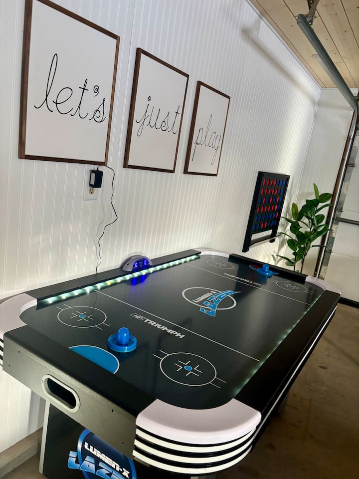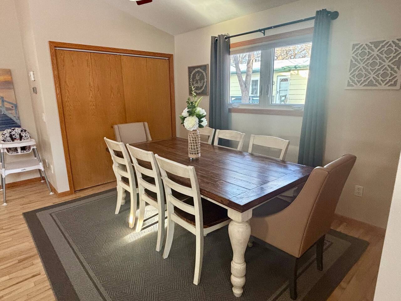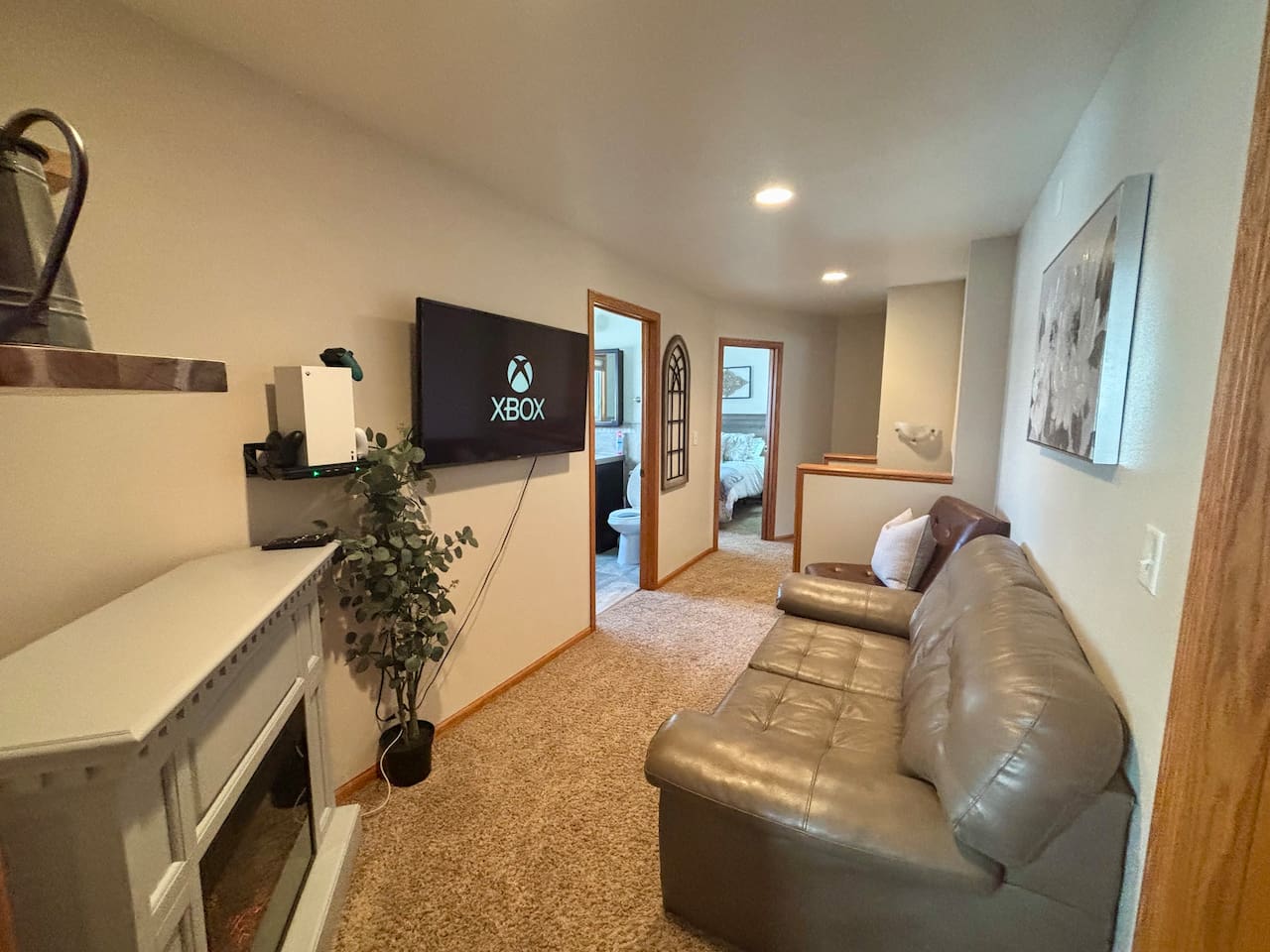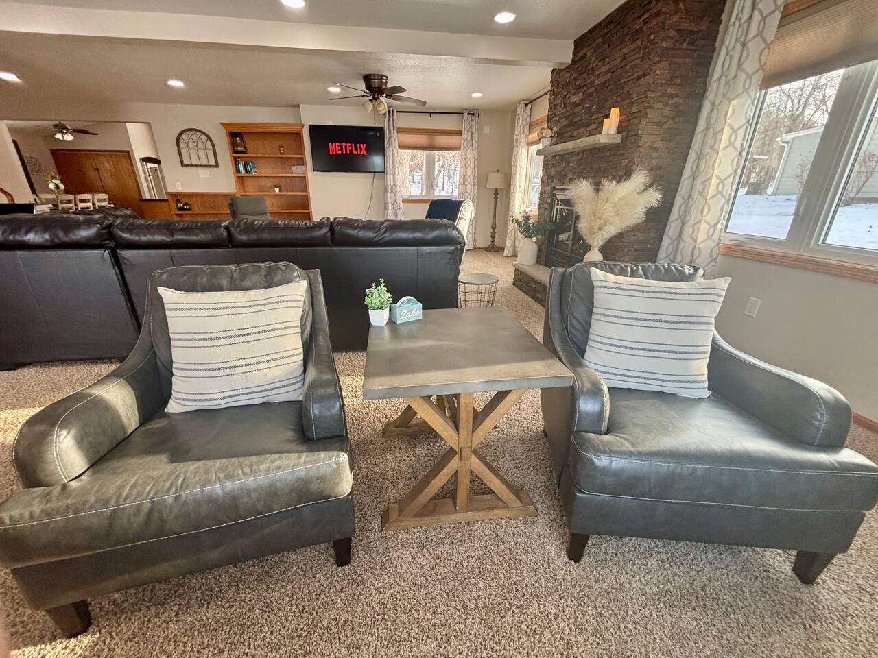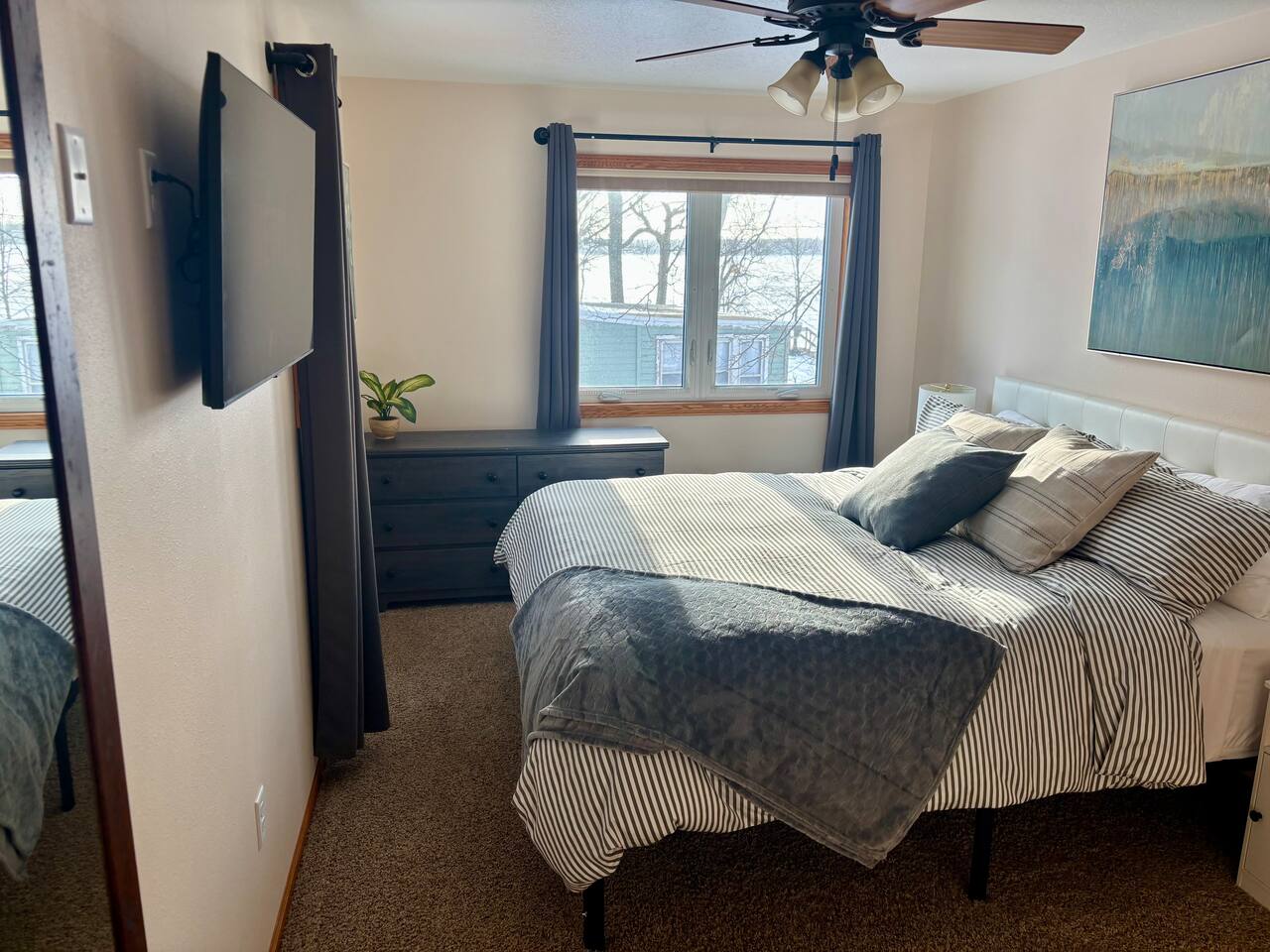 Sunset Beach Getaway is the kind of place where families slow down, spread out, and truly reconnect. From the moment you step inside, the open-concept main floor welcomes you with space to gather, laugh, and linger. Sunlight pours through large windows into the living room, where a cozy natural gas fireplace sets the tone for relaxed mornings, board-game afternoons, and quiet evenings after a day on the lake. The heart of the home is the fully stocked kitchen—designed for real cooking and shared meals. With every appliance and amenity you need, it’s easy to prepare everything from pancake breakfasts to holiday-style dinners. The dining area comfortably seats 13, with a high chair ready for the youngest guest, making this home ideal for multi-generational stays. Just off the main living space, the spacious primary bedroom offers a peaceful retreat with a queen bed, while the large main-floor bathroom feels spa-like with double sinks, heated floors, and a jet tub/shower combo. A washer and dryer on the main level make longer stays effortless. Upstairs, the home continues to impress with thoughtfully designed sleeping spaces for every age and stage. One bedroom features a queen adjustable bed for customized comfort, while another offers a twin-over-full bunk plus an additional twin—perfect for kids or teens. Two generous bedrooms feature California king beds, one paired with a twin bed and the other connected to a dedicated children’s playroom filled with LEGO Duplos, a train set, blocks, an art table, and books—giving kids their own space to imagine and play. The upstairs bathroom includes a roomy tiled walk-in shower with a removable shower head, making mornings easy for groups. Entertainment extends beyond the house into the heated detached garage game room—a favorite gathering spot year-round. Outfitted with comfortable seating, a fireplace, Big Buck Hunter and Pac-Man arcade games, air hockey, wall-mounted Connect 4, and ping pong, it’s the perfect hangout for teens, kids, and adults alike. Smart TVs are available throughout the home—including every bedroom, living spaces, and the game room—so everyone can unwind their own way. Outside, the magic of Sunset Beach truly comes alive. The back deck offers seating for six and a propane grill for easy outdoor meals, while the front deck invites morning coffee and evening conversations with cushioned outdoor seating. As the sun dips low, gather around the fire pit under glowing string lights, settle into Adirondack chairs, and watch the sky turn gold and pink. The sandy beach is ideal for all ages, with loungers ready for lakeside relaxation. A nearby shed is stocked with outdoor games, sand toys, life jackets, two kayaks, and four paddle boards—everything you need for full days on the water. For those looking to explore the lake even further, a pontoon rental is available for an additional fee, adding an extra layer of adventure to your stay. Sunset Beach Getaway isn’t just a place to stay—it’s a place to make memories. Whether you’re hosting a family reunion, traveling with grandparents and grandkids, or gathering friends for a lakeside escape, this home was designed for comfort, connection, and unforgettable moments by the water.